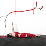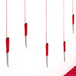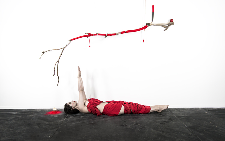 Apple Of Discord Project, 2014, Installation II, Branch, knife, gilded apple, red yarn, red apple, flocking powder, 250cm - Detail