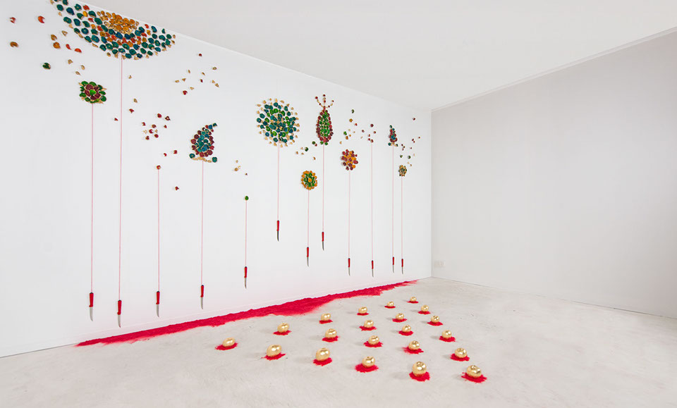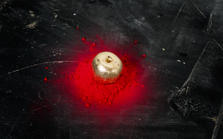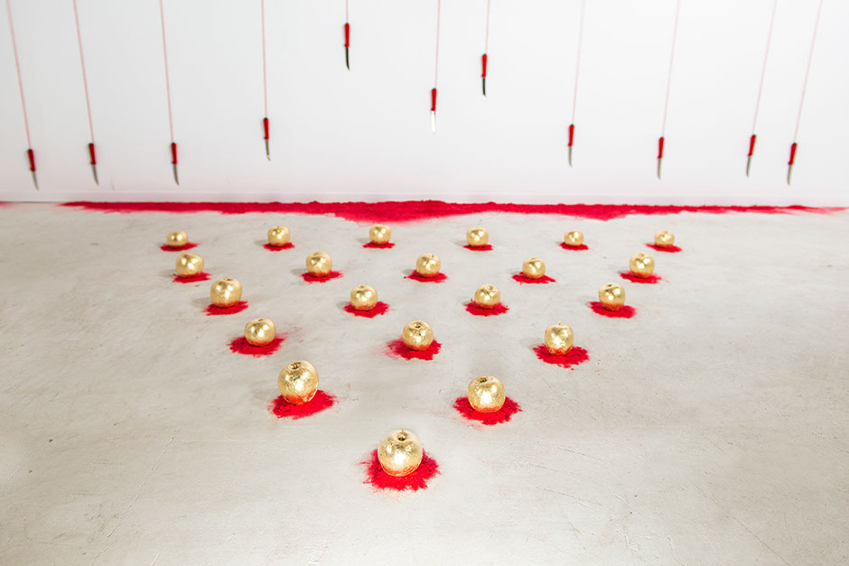 Apple Of Discord Project, 2014, Gilded apples, processed apple slices, knives, red yarn, flocking powder, 250cm x 450cm x 200cm - Detail