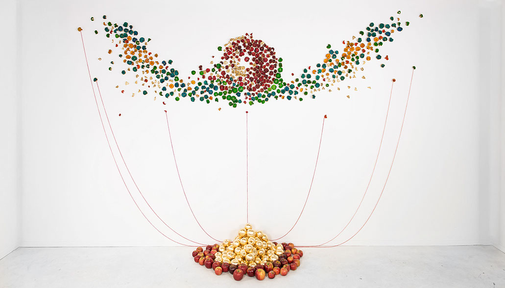 Apple Of Discord Project, 2014, Apples, gold leaf, processed apple slices, pins, red yarn, 250cm x 390cm