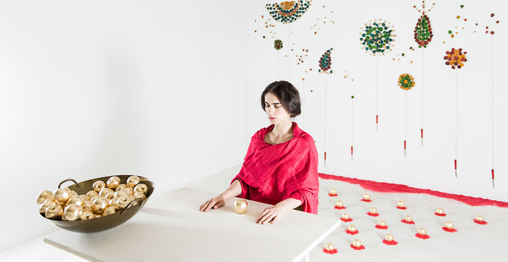 Apple Of Discord Project, 2014, Gilded apples, processed apple slices, knives, red yarn, flocking powder, 250cm x 450cm x 200cm