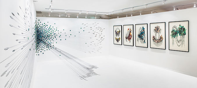In ‘Blooms of Hesperides’ the apples are doubly seductive in their presentation as blooms. In the installation ‘Blueming’, slices of the golden apple have been arranged into a flower pinned to the wall. It is a striking conceit, the cleverness of which draws the viewer closer, only then to realise that the plant’s tendrils are held taut by knives that threaten to entangle and incise. In the series of drawings, ‘Blossoming diversions’, the sliced apple has been used as a stamp to render soft and painterly shapes that appear decorative at first but then strangely suffocating. Bound and circumscribed by snaking lines, the blossoms are also densely overlaid with ink. All are works that both lure and menace.