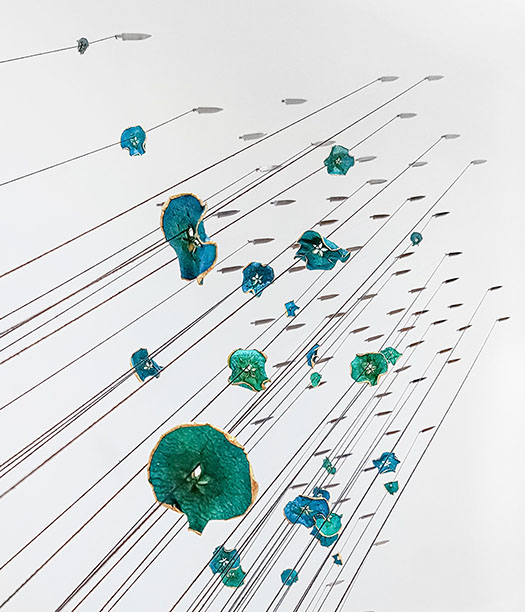 Hundreds of gilded, dried and hand-dyed apple slices are pinned to the wall and threaded onto a taut, cotton string. Surrounded by a mass of stainless steel knife blades, they burst into space forming a large bloom-like shape with black tendrils that pull the audience towards it.