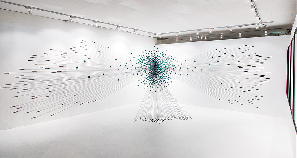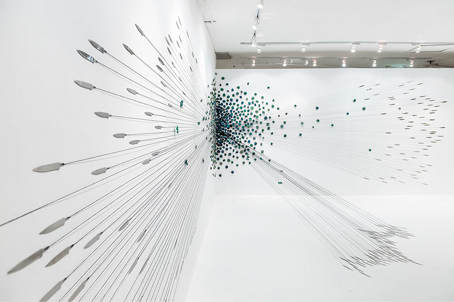 Hundreds of gilded, dried and hand-dyed apple slices are pinned to the wall and threaded onto a taut, cotton string. Surrounded by a mass of stainless steel knife blades, they burst into space forming a large bloom-like shape with black tendrils that pull the audience towards it.