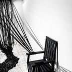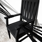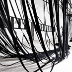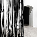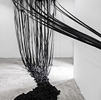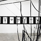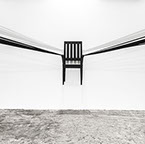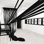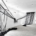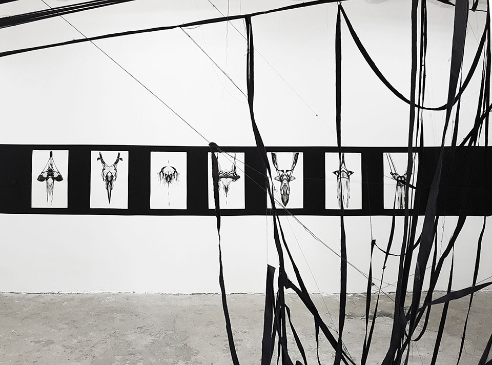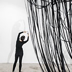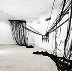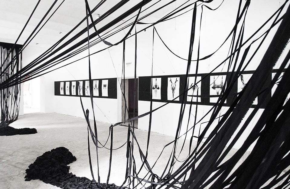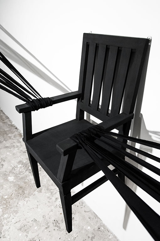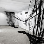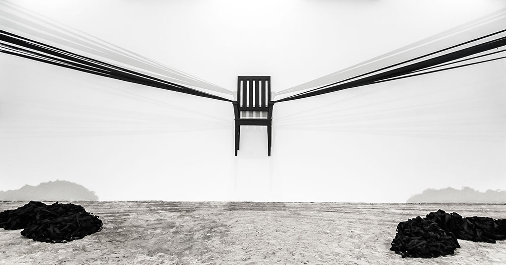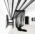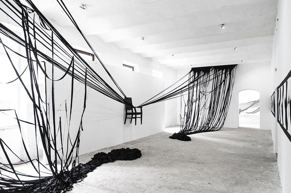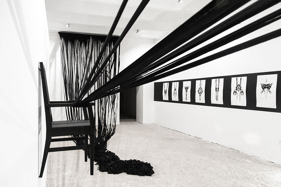 BOUND, 2017 - black fabric, wooden chair, black paint, paper, ink. Gallery dimensions: 16m x 6m x 4m
