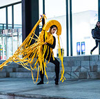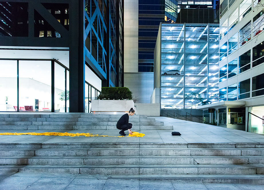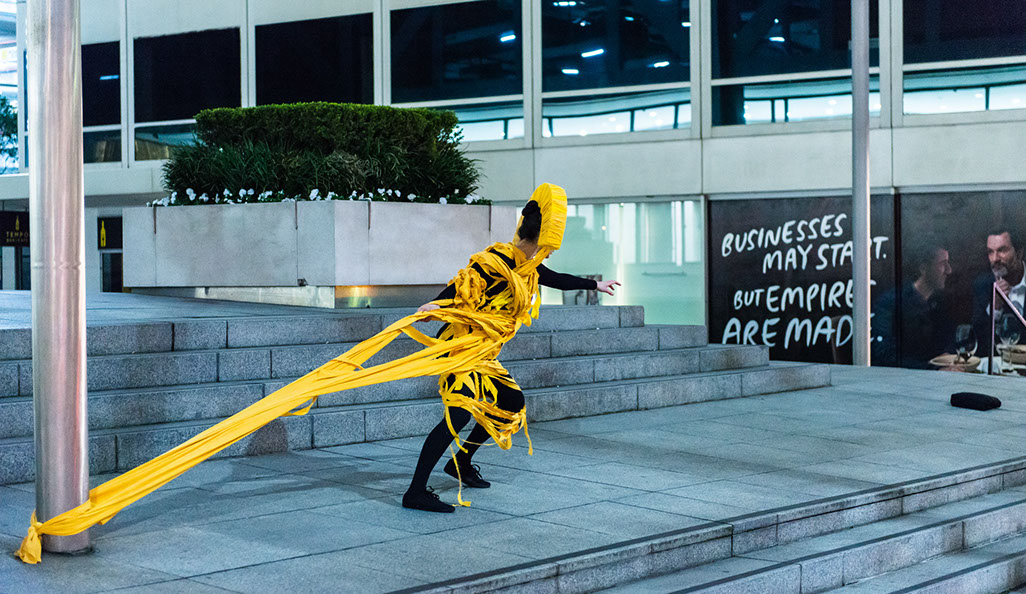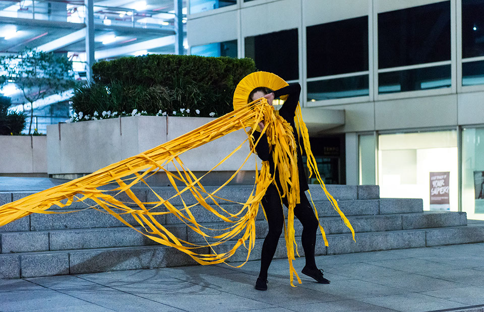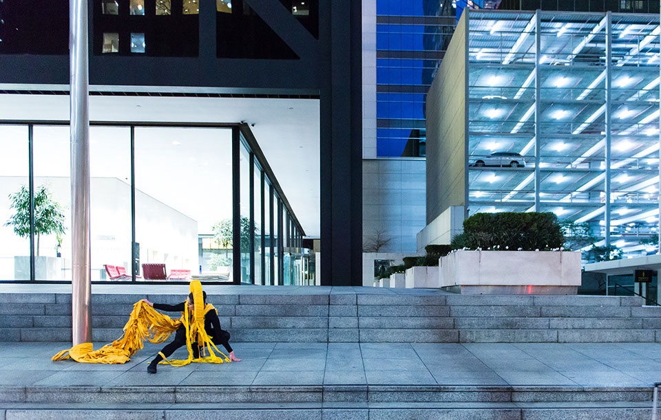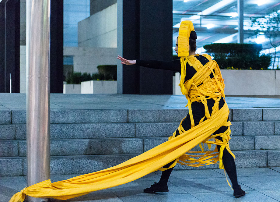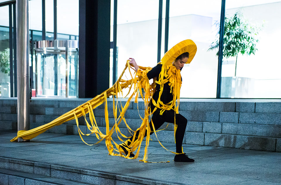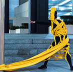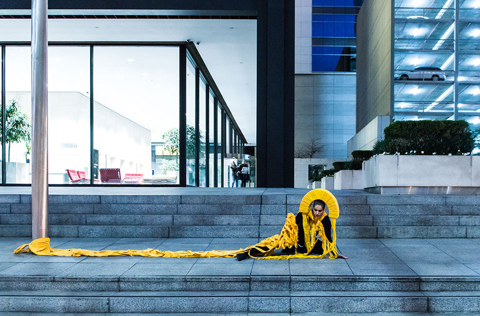 The yellow fabric entangling the performer's body alludes to obstacles and past hindrances that the artist is trying to break away from. The silent, ritualistic action of pulling, de-tangling, taking off the headdress - the past, and putting on the coat - the future, communicates struggle, change and hope. The work questions whether it is necessary to completely sever the links to negative past experiences in order to make space for forward movement and change.