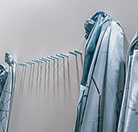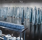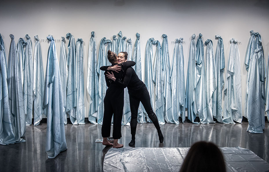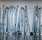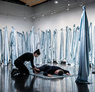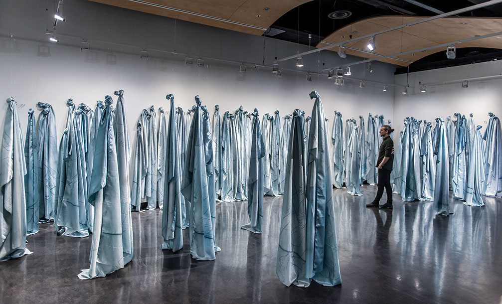 THE GATHERING, 2019, hand dyed satin, charcoal, ink, pins, timber, nylon string. Dimensions variable.