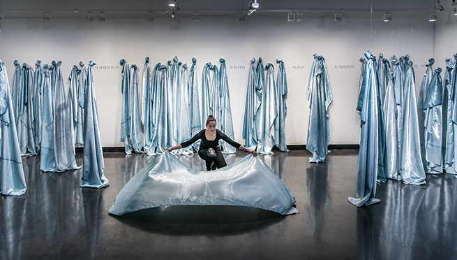 Around the space, mounted on the walls and clustered in groups in the centre, are swathes of light blue satin bunched at the top to give them a humanistic appearance. They appear as cloaked and silent sentinels, keeping a watchful vigil, or perhaps immersed in their own meditative reverie. This is The Gathering, an installation that grows throughout the exhibition. The soundtrack is coming from a video work projected onto the wall, Healing Gestures, featuring dancers Benjamin Hancock, Alexandra Petrarca and Este herself performing a slow, graceful unfolding movement. With fluid intimacy, Este’s hands slowly trace the contours of the dancers’ bodies, accompanied by a meditative spoken-word piece by psychotherapist Debbie Ford. Completing the installation is a stainless steel table, Stabilisers, almost jarring with its clinical overtones. Perfectly-folded bundles of the same cloth used for The Gathering – hundreds of metres of hand-dyed satin – await upon the reflective surface of the table, in readiness for an intimate ritual to be performed between Este and her audience.